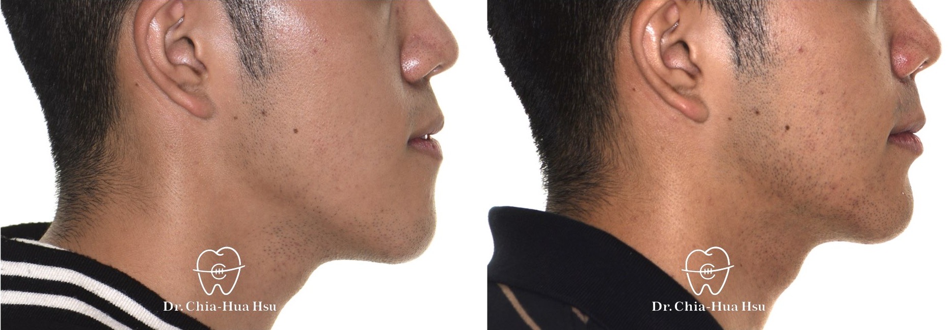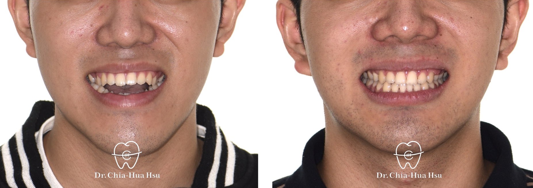 - 20多歲的日籍大學生小時候有做過矯正治療,不過下顎骨隨著年紀持續生長,變成戽斗且開咬的樣子。於是,患者接受了矯正合併正顎手術,不但改善外觀,也改善了咬合功能與牙齒排列(患者很開心可以咬斷麵條)。
