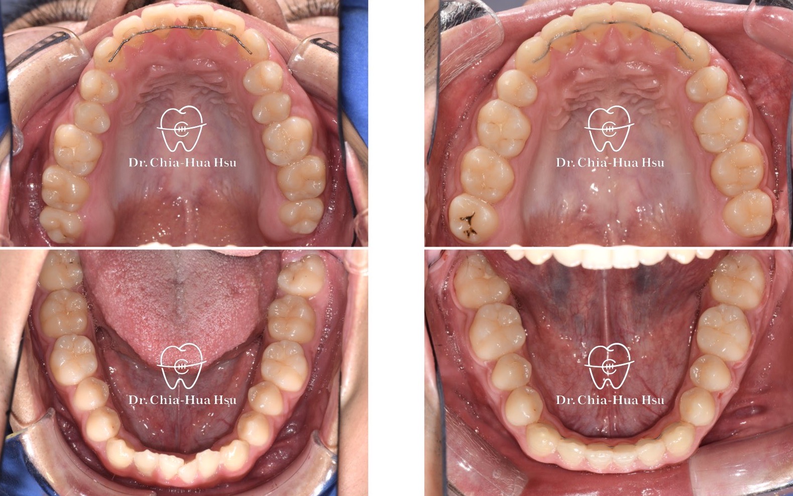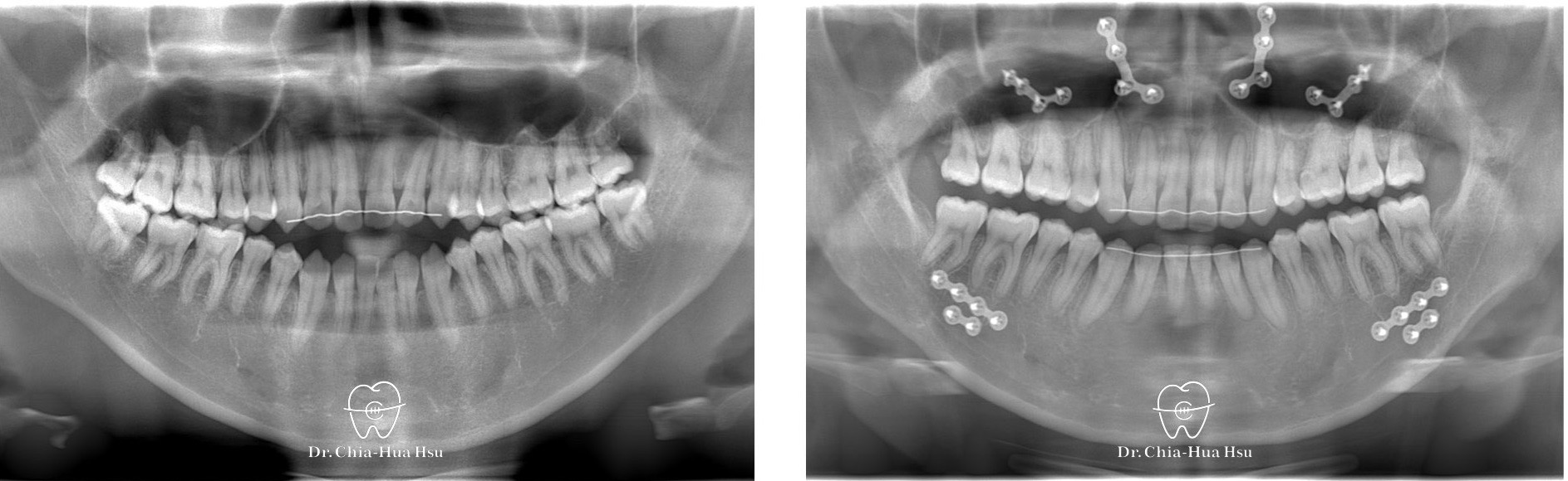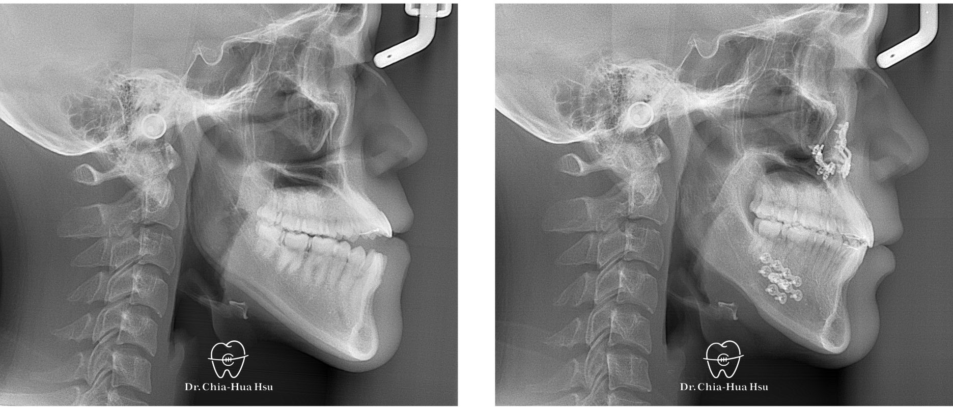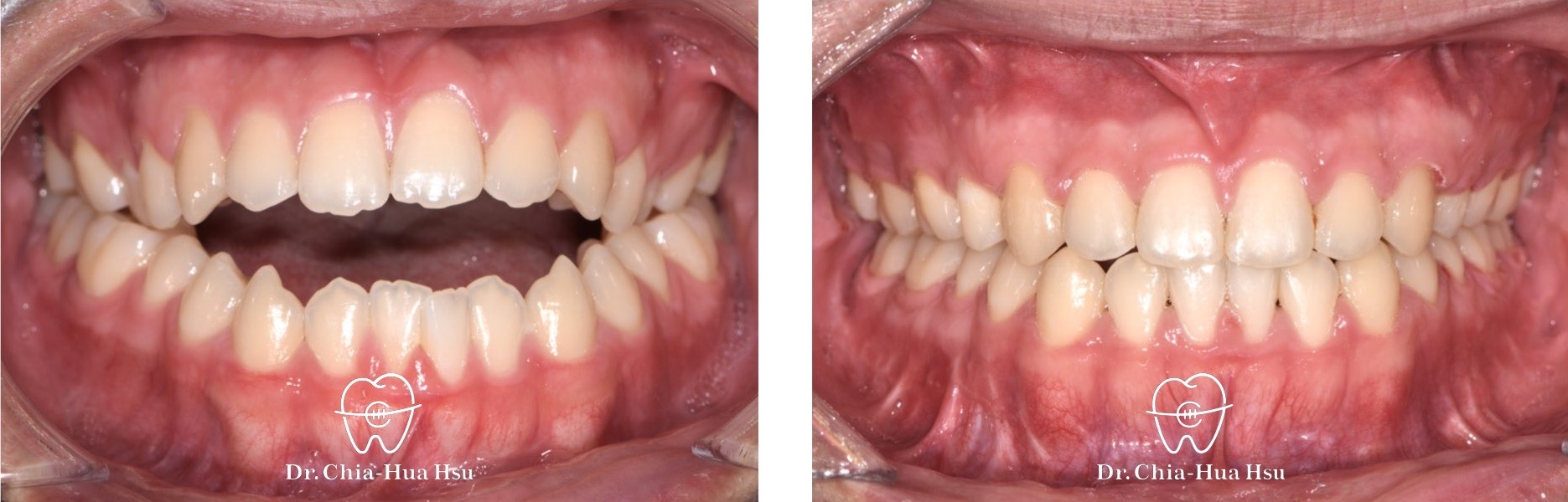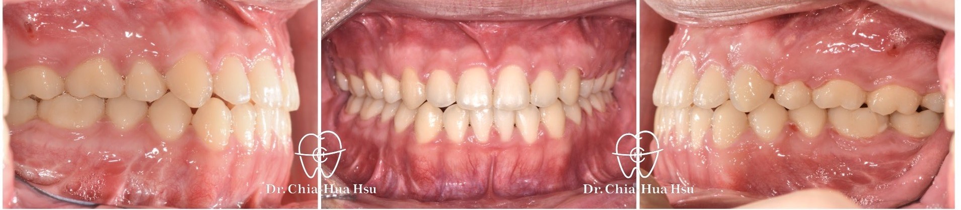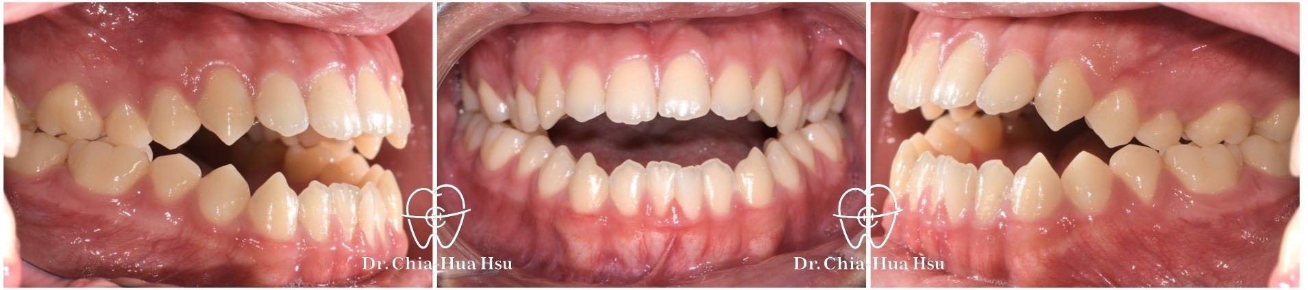- 治療方式:使用傳統金屬矯正器,合併正顎手術(雙顎),上顎拔除兩顆小臼齒以利手術方式進行上顎牙弓擴寬。