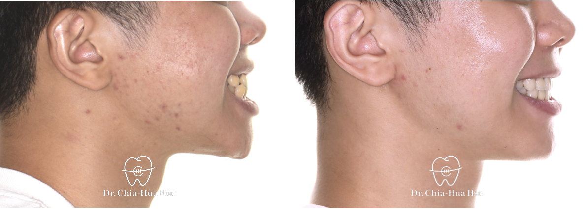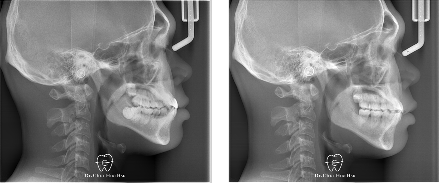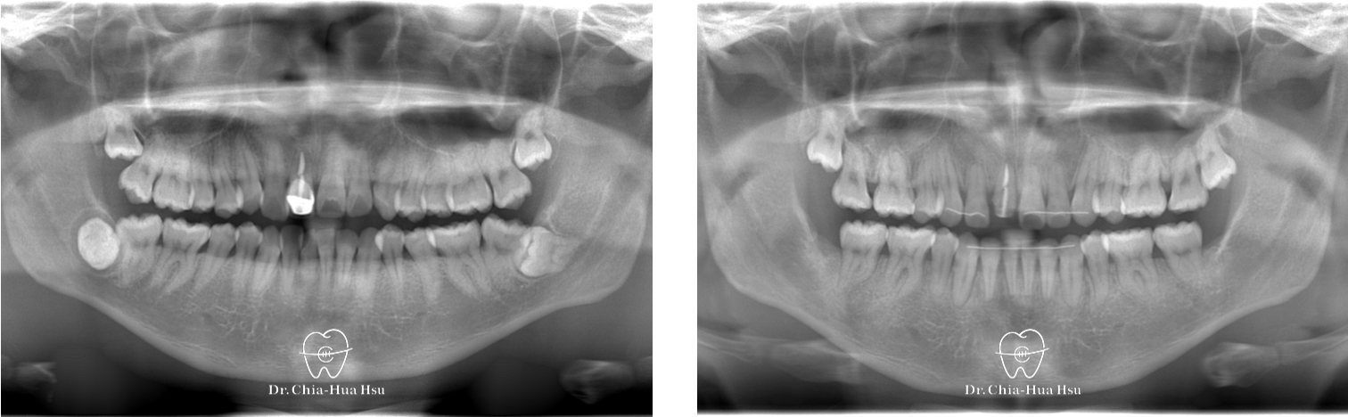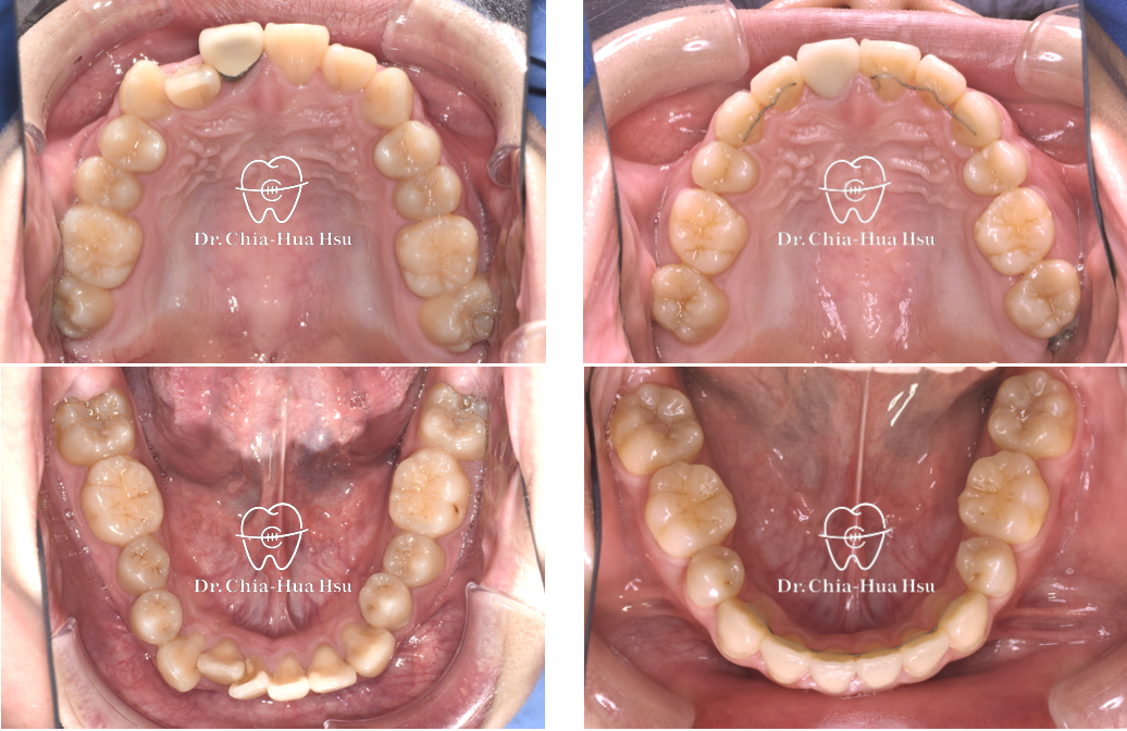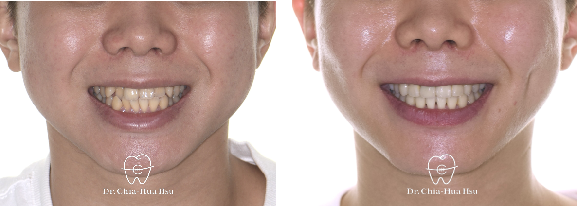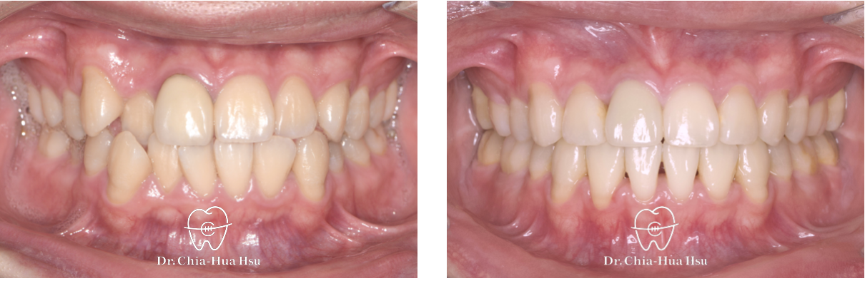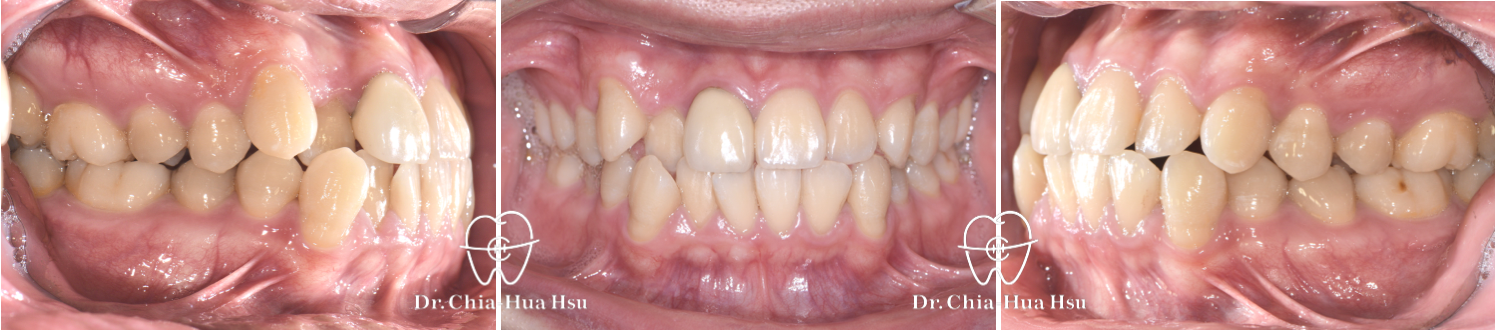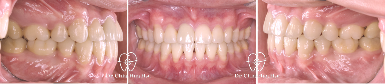 • 治療方式:拔除四顆小臼齒,使用傳統金屬矯正器將牙齒排列整齊、咬合緊閉。