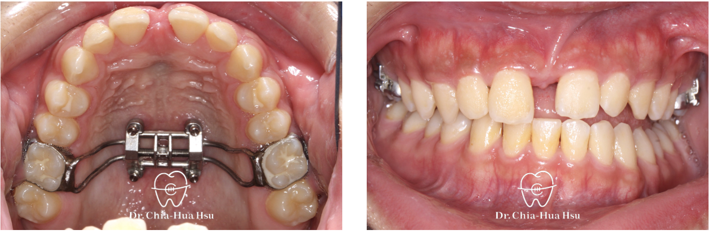 上顎擴弓:青少年使用骨釘輔助上顎擴弓器,將過窄的上顎牙弓撐寬。