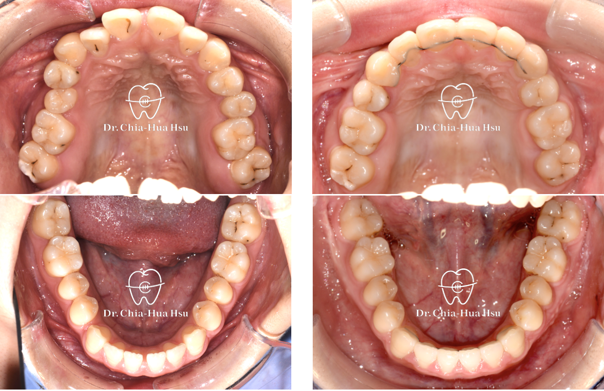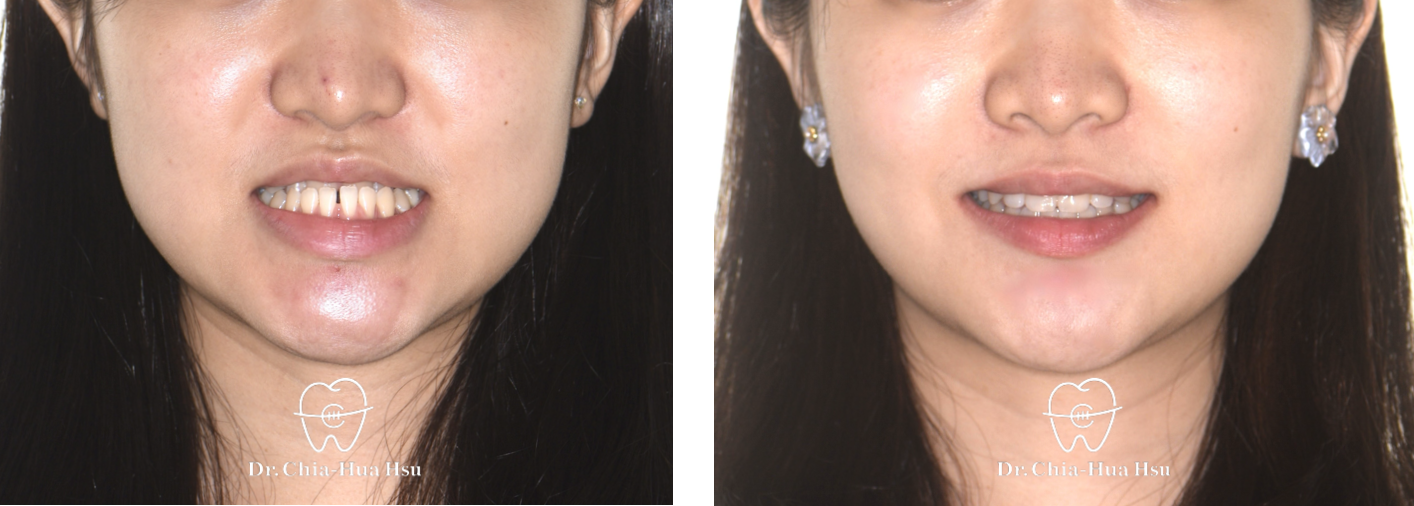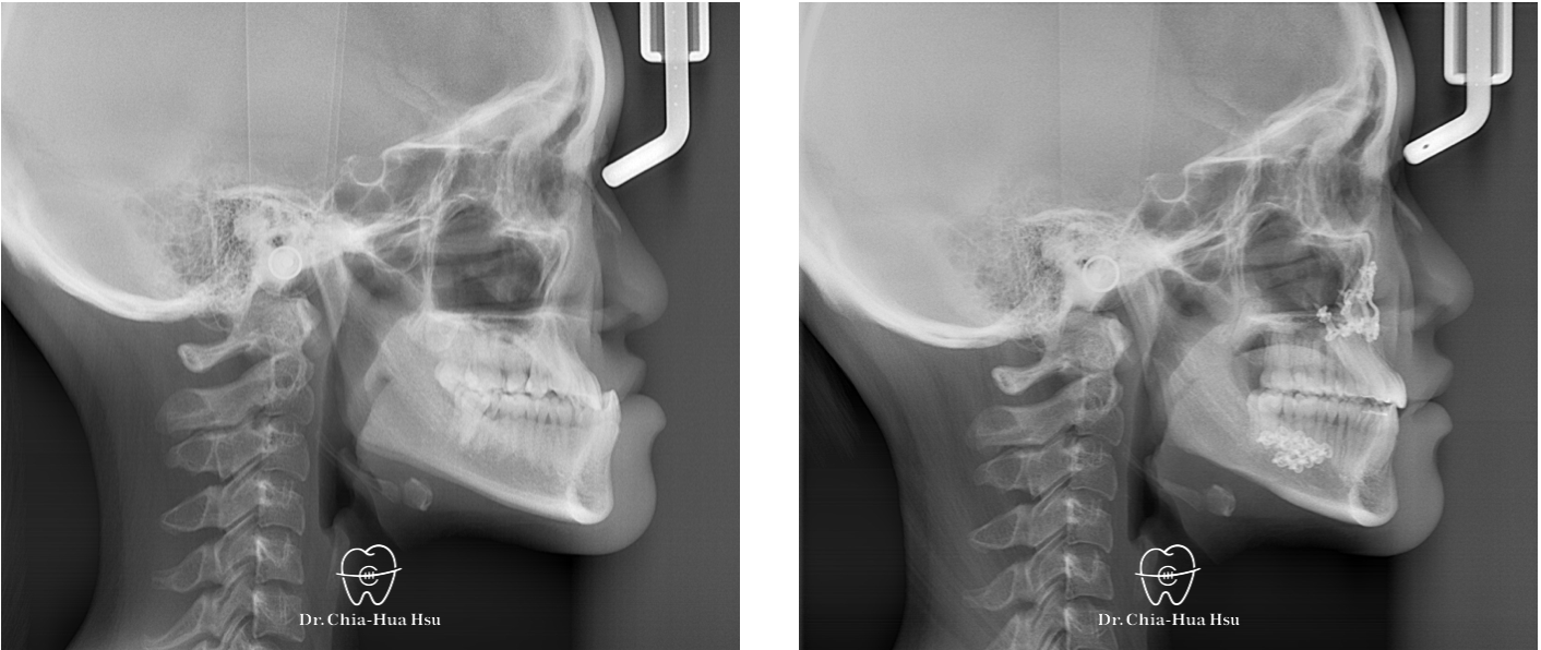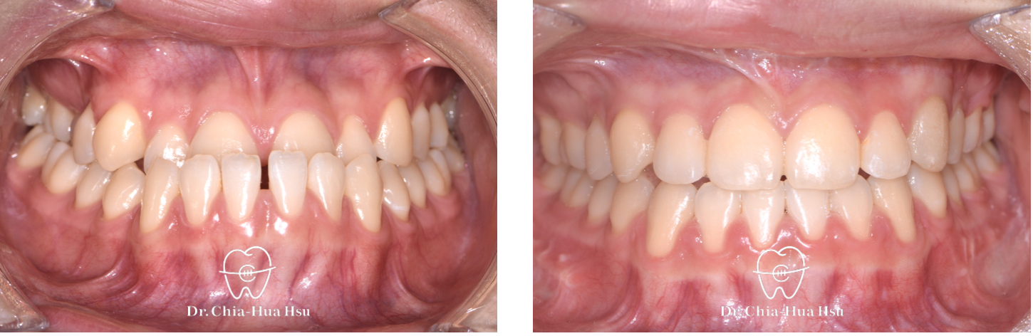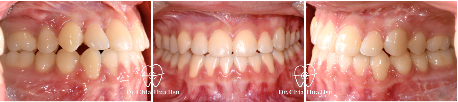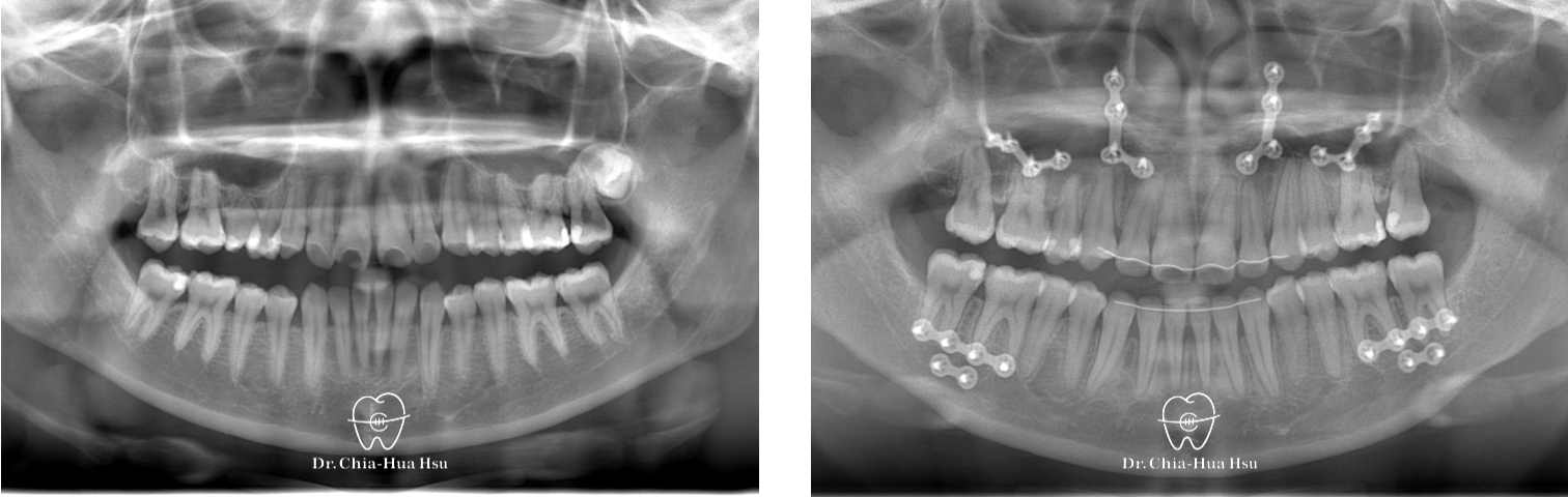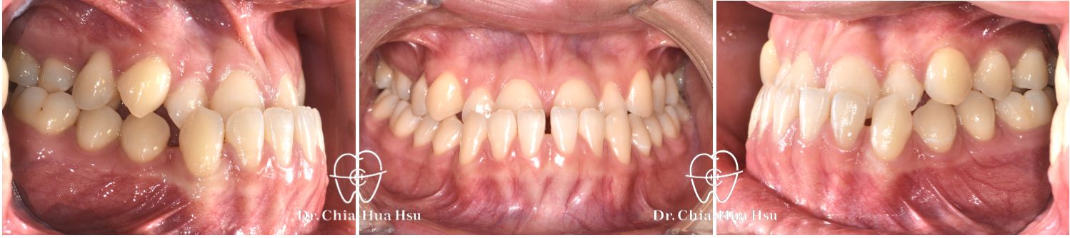 - 治療方式:使用傳統金屬矯正器,合併正顎手術(雙顎),上顎拔除兩顆小臼齒以利手術方式進行上顎牙弓擴寬。