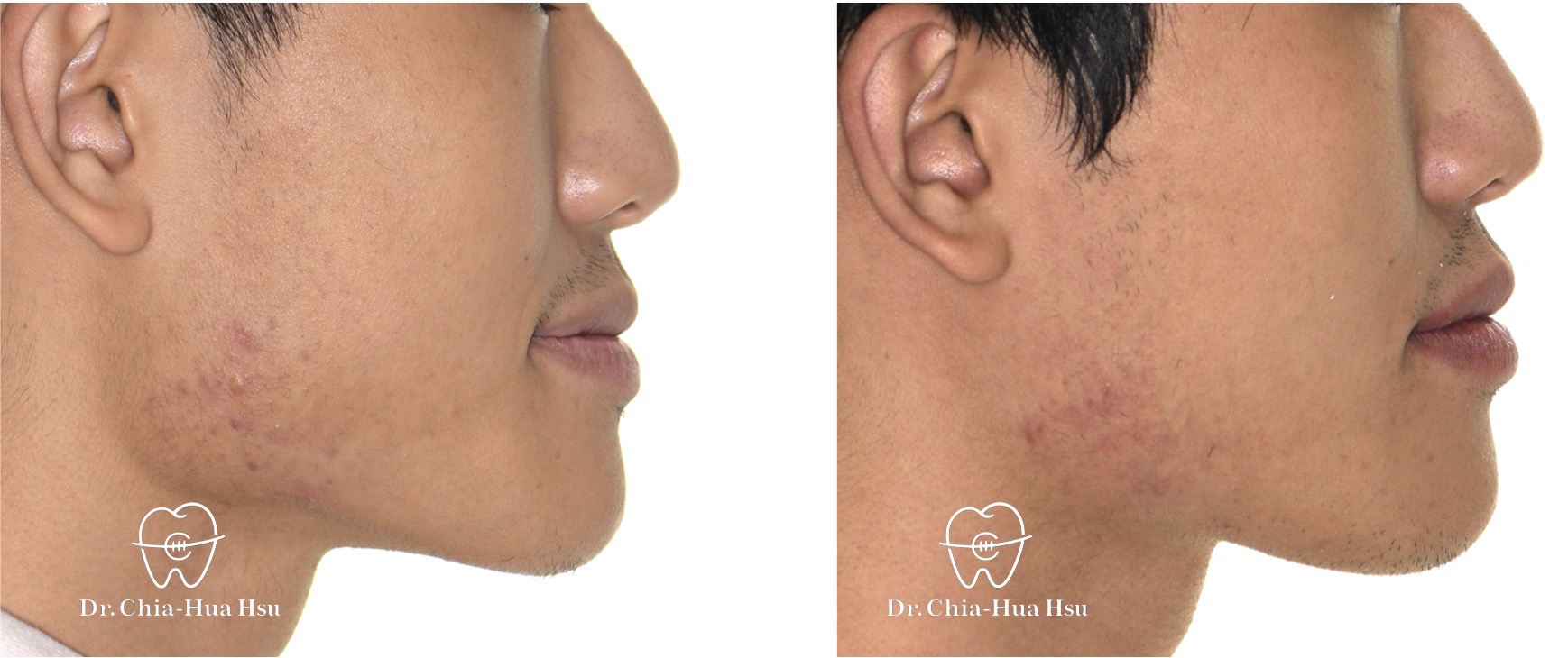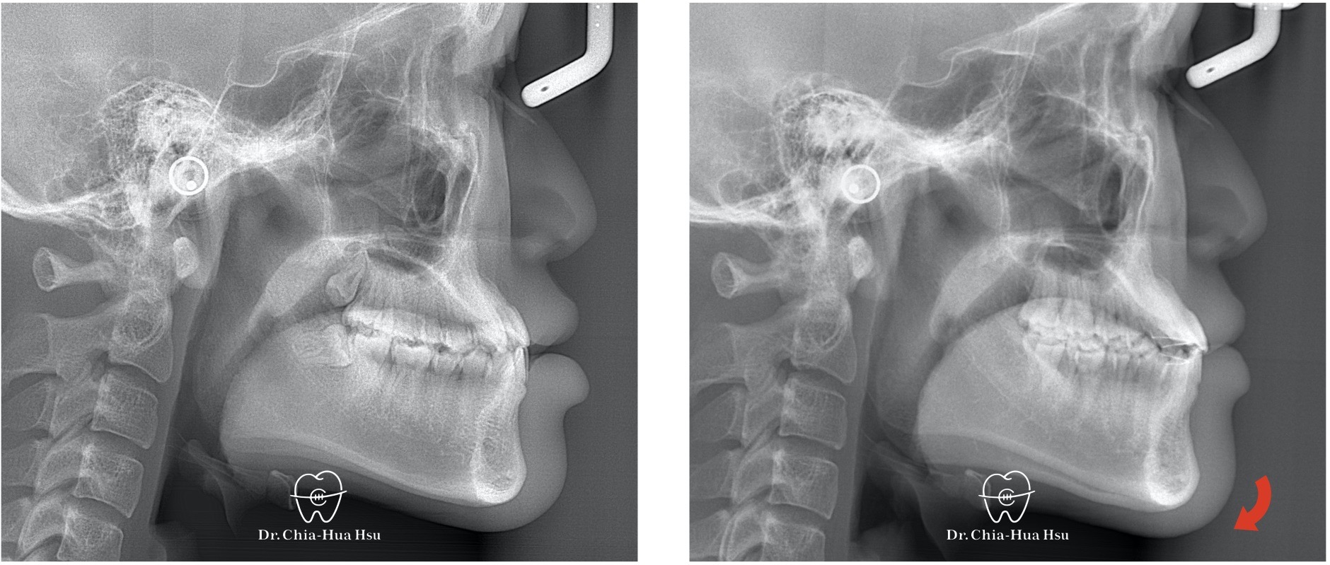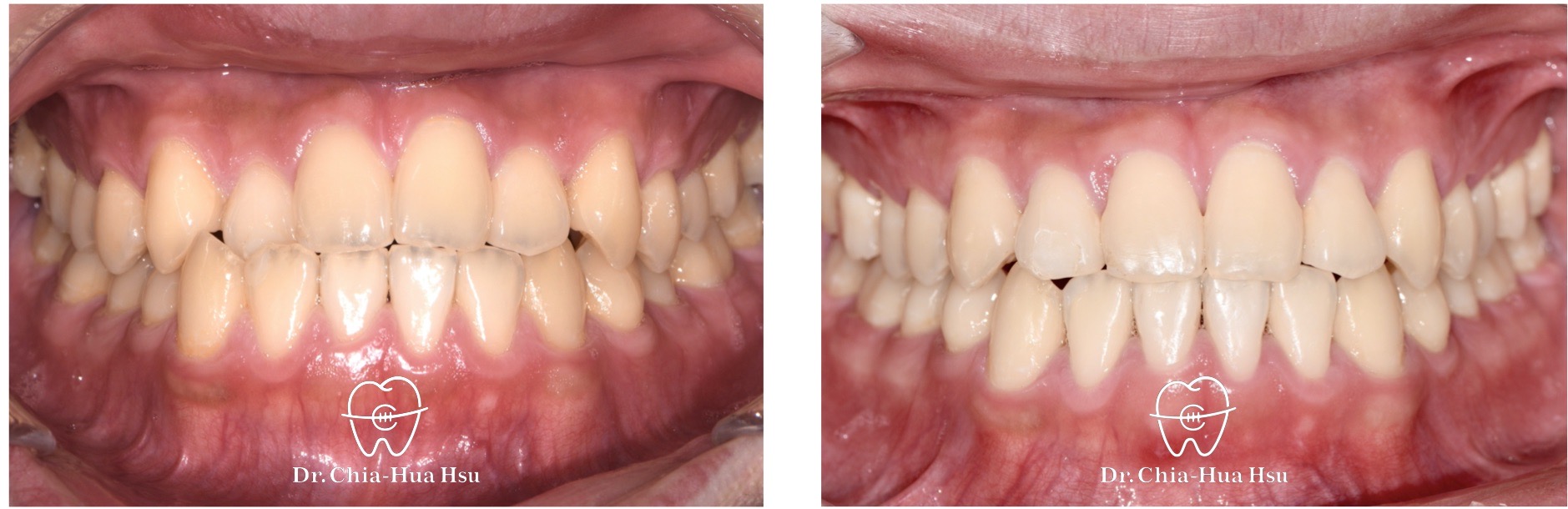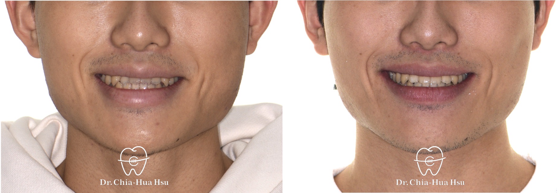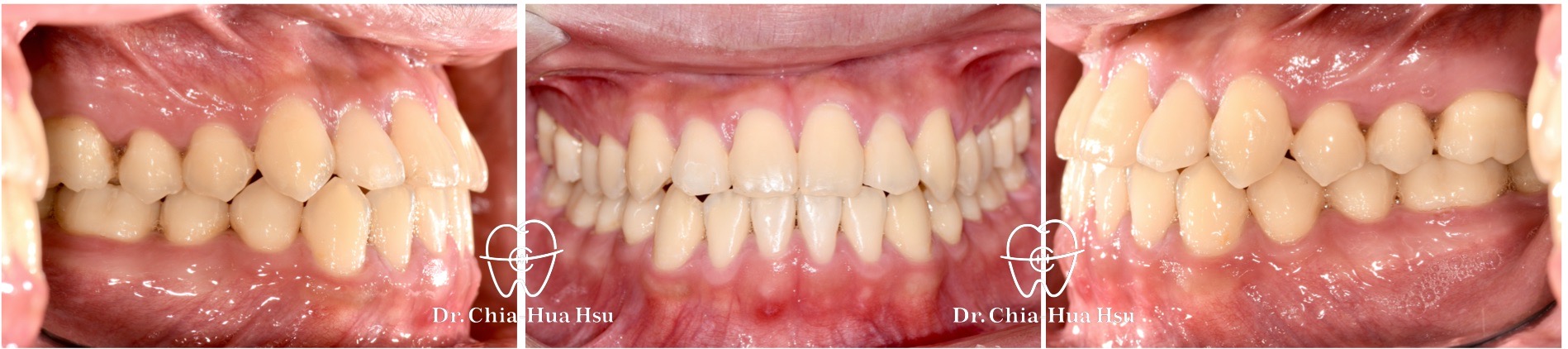 • 治療結果:門牙露出增加、齒列排齊 ; 下臉部高度微增使下巴順時針微量旋轉,以修飾戽斗臉型。