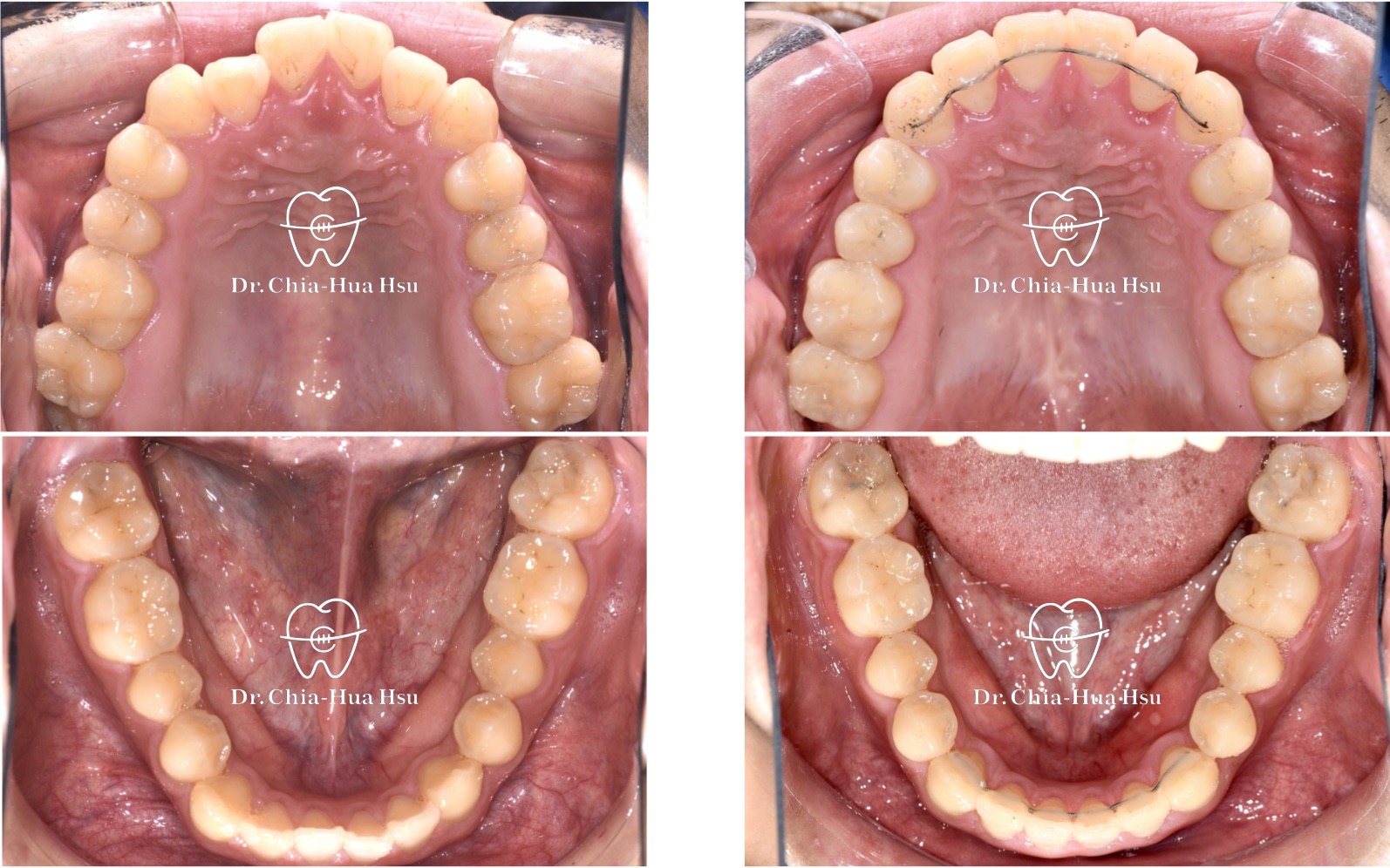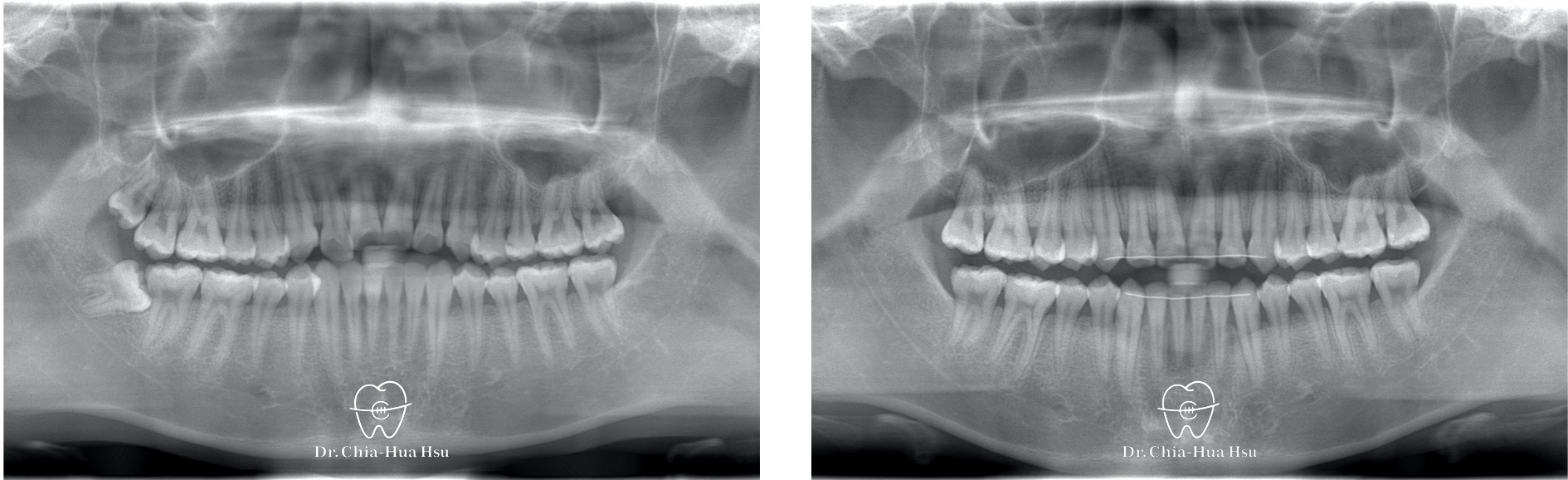 • 治療方式:使用傳統金屬矯正器,並搭配垂直向橡皮筋牽引(Vertical elastics)使牙齒萌出。