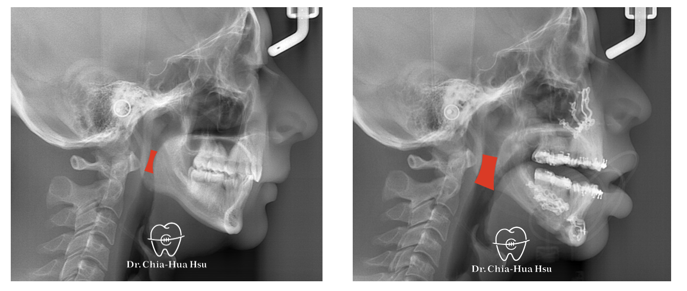 左圖為治療前之側顱X光攝影,右圖為手術後一天拍攝之側顱X光攝影,明顯可見其呼吸道狹窄獲得改善,患者術後睡眠品質亦大幅改善。