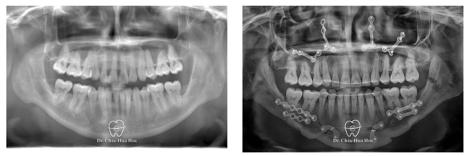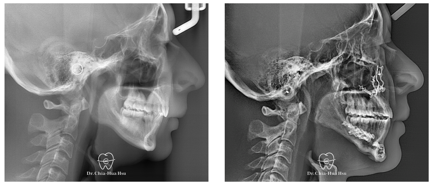 • 治療方式:使用傳統金屬矯正器,合併正顎手術(雙顎),以手術方式將下顎骨前移改善呼吸道與外觀。