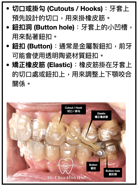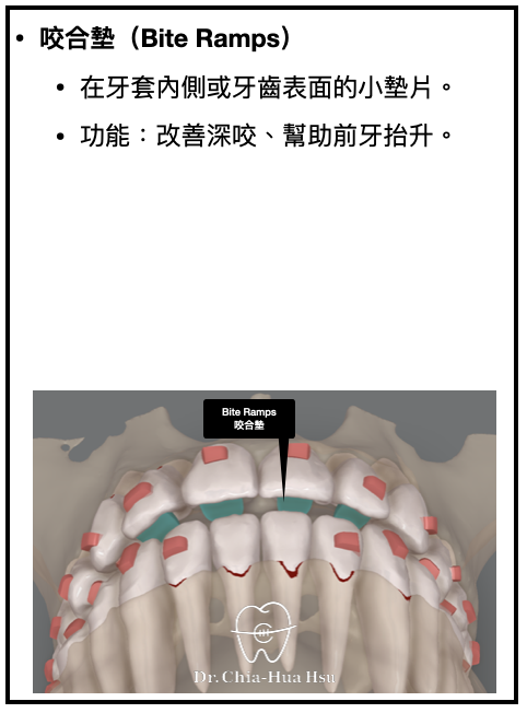 - 咬膠 (Chewies):俗稱QQ,小圓柱狀的軟膠。用來增加牙齒和牙套的密合度,也可以加速牙齒的移動。每次戴上牙套後一定要咬QQ,尤其是剛換新牙套時一定要勤勞的咬!