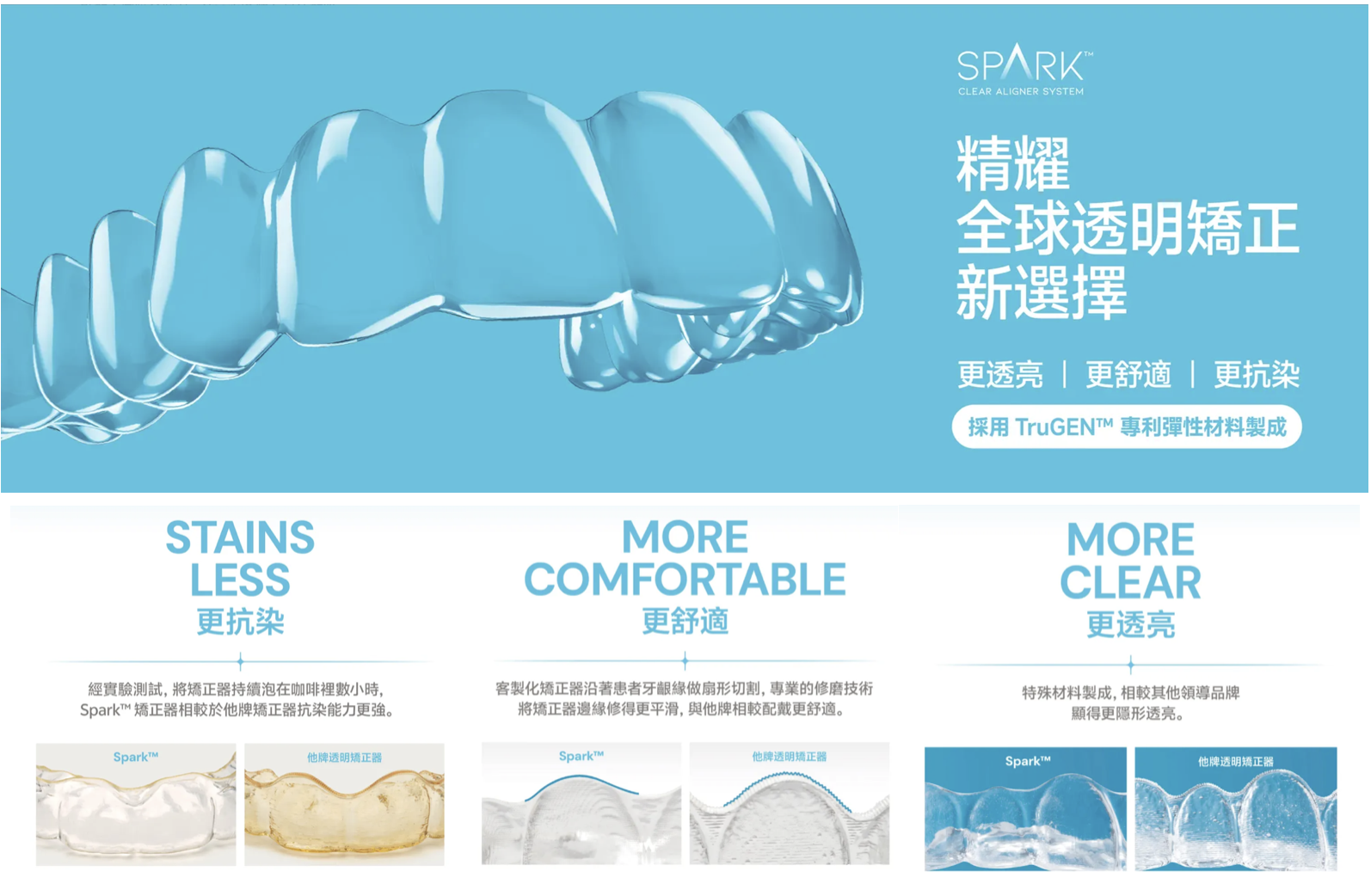 Spark 採用 TruGEN™ 專利彈性材料,擁有卓越透亮度、舒適度,並且具備優異抗染力,配戴時幾乎隱形不刮口腔,更加貼合牙齒表面,能夠精準控制牙齒移動,顯著縮短治療時間並提升矯正效果,為患者帶來更佳的治療體驗。