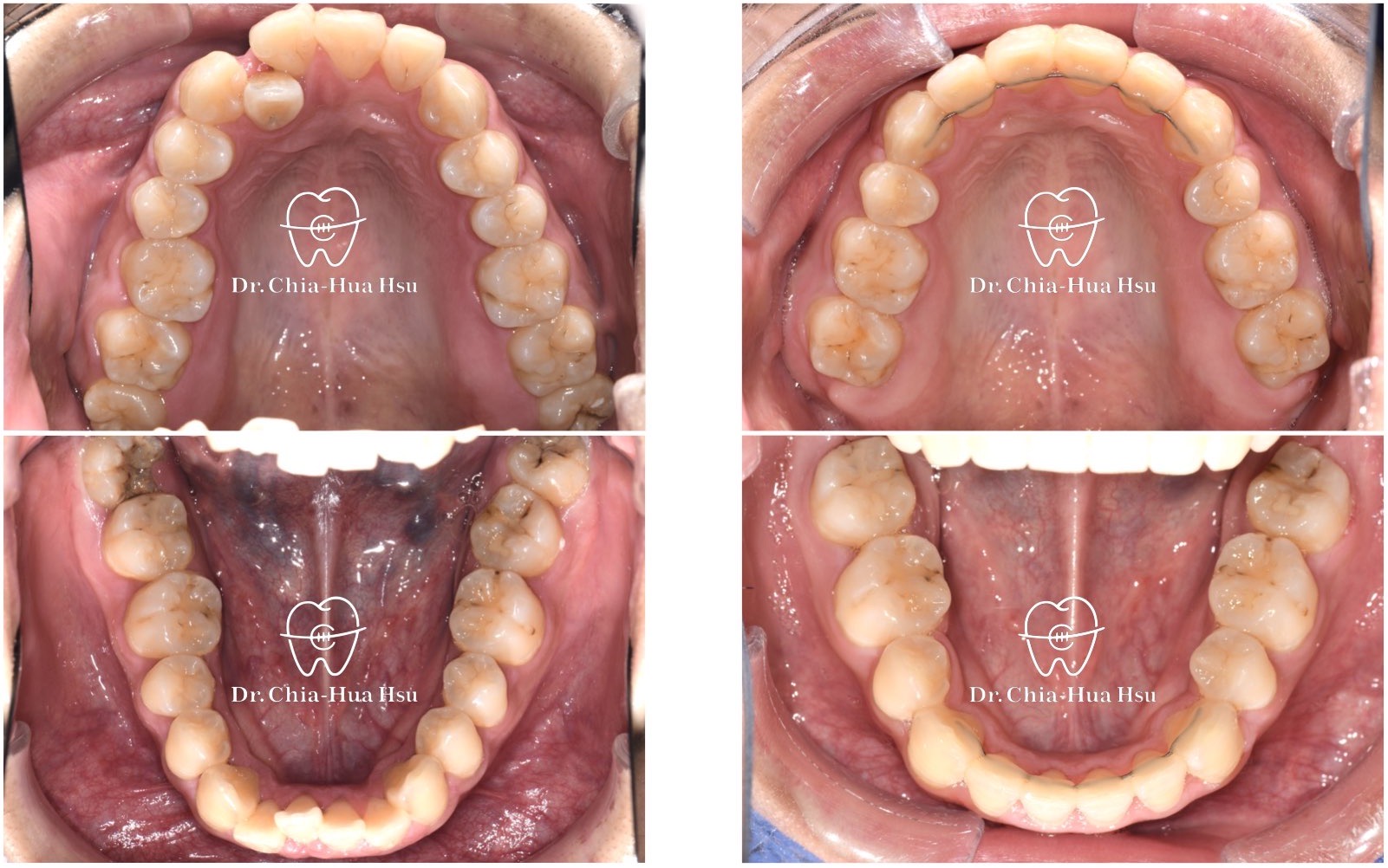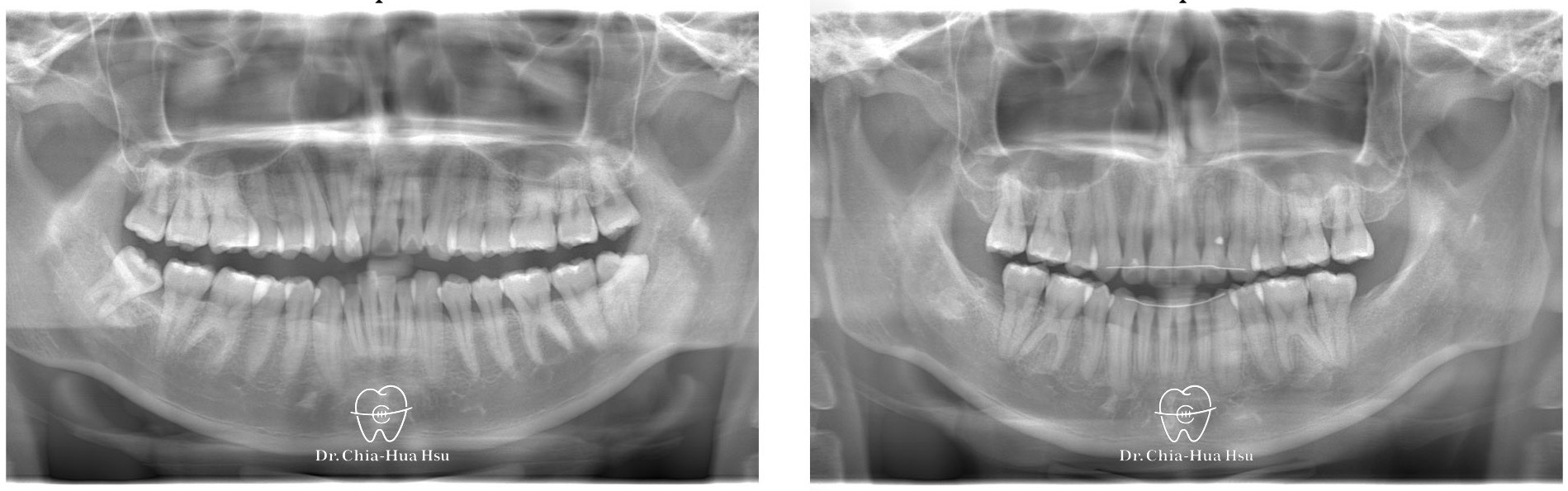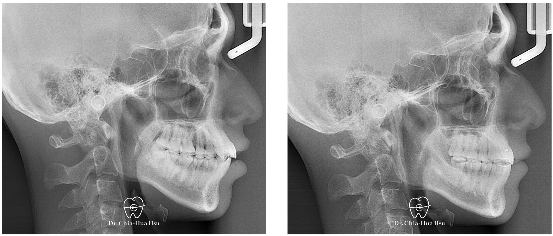 - 治療方式:使用傳統金屬矯正器,拔除四顆小臼齒獲得空間,搭配二級橡皮筋牽引(Class II elastics)。