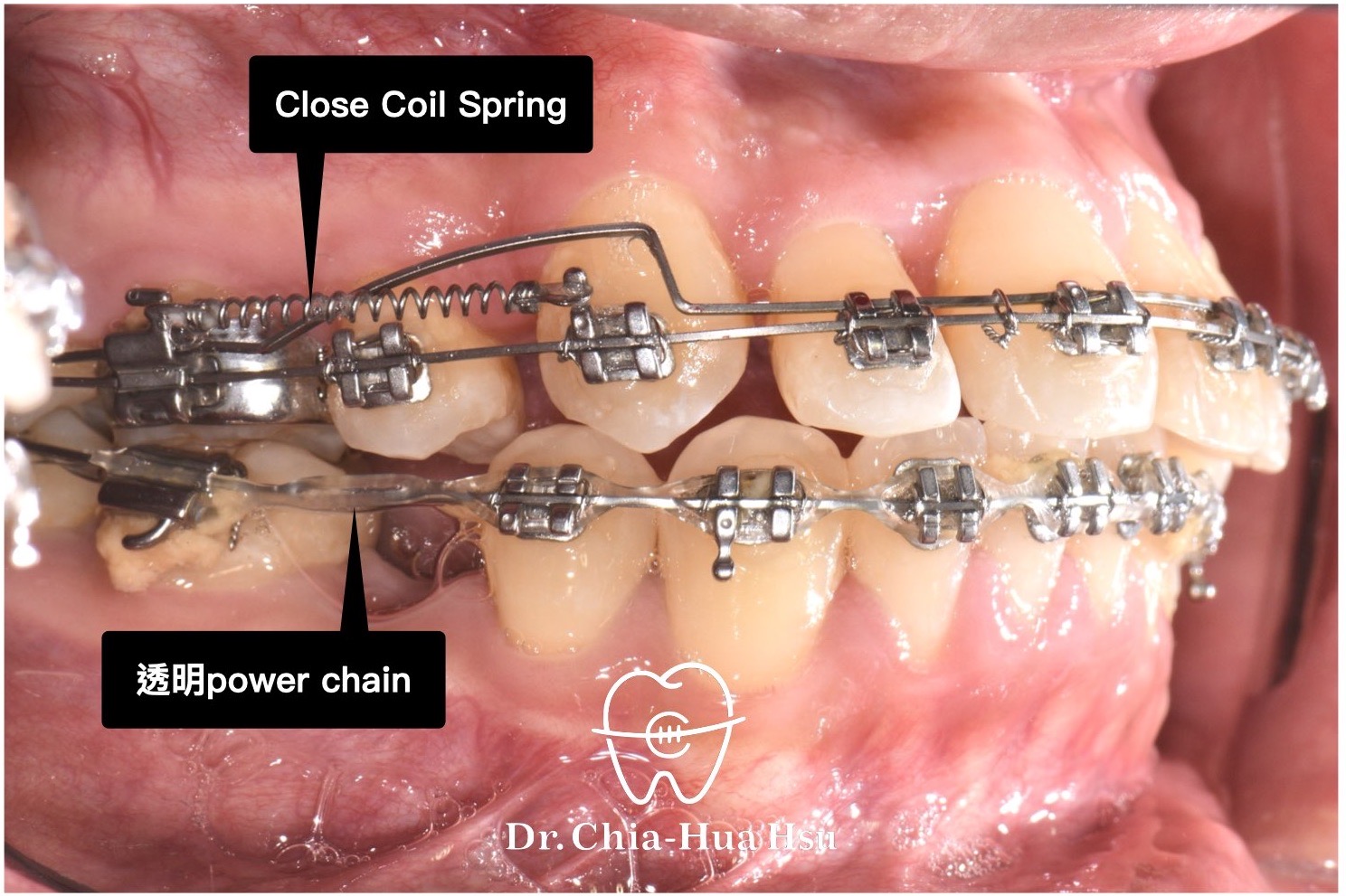 - 治療過程:治療過程中,上顎使用關閉型矯正彈簧(close coil spring),而下顎使用透明橡皮鏈(power chain),來將拔牙空間關閉。