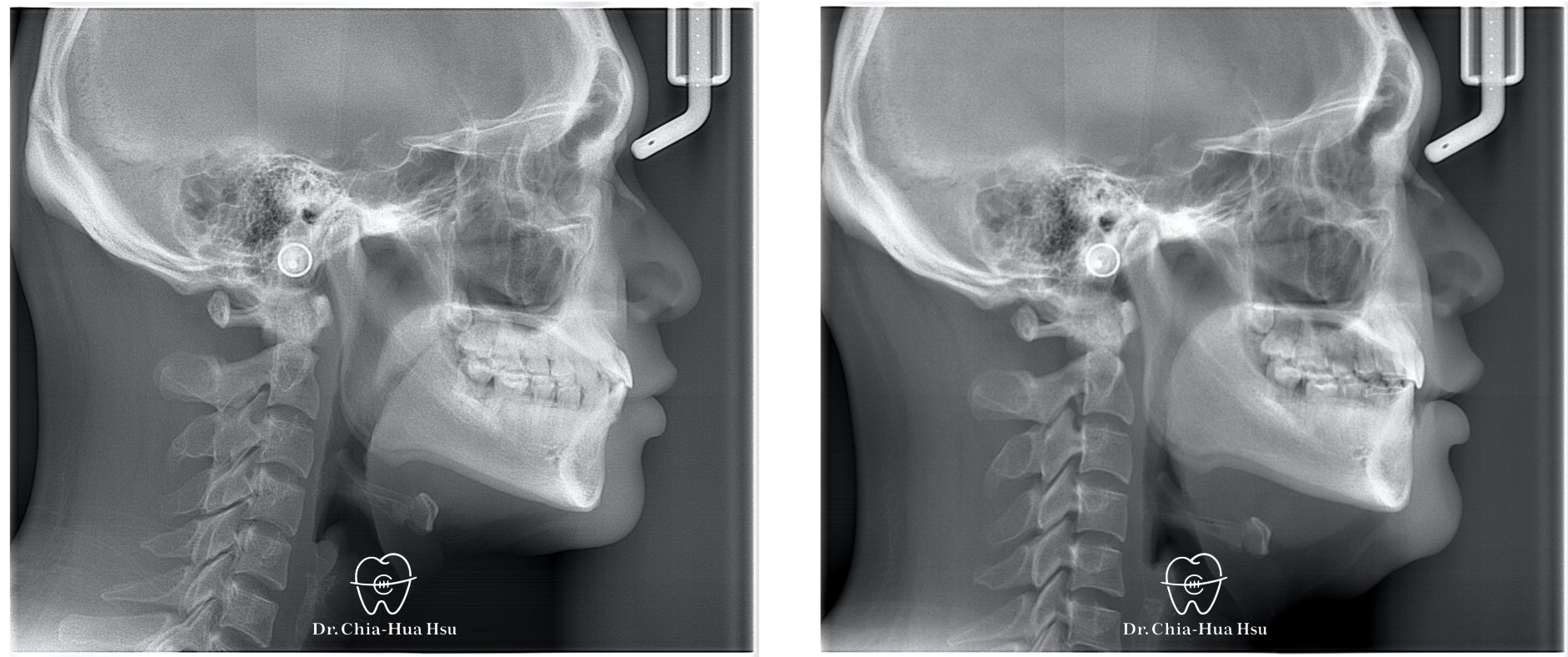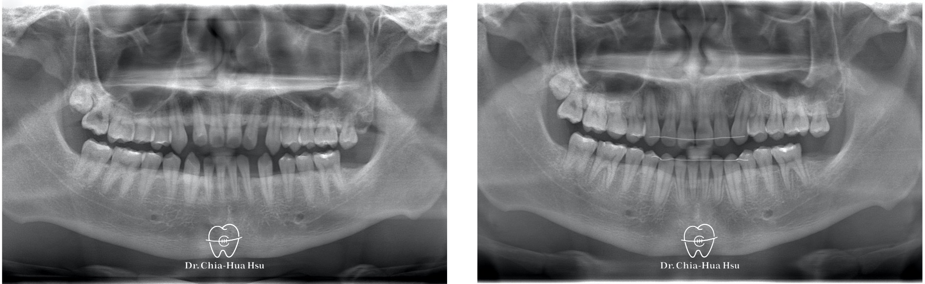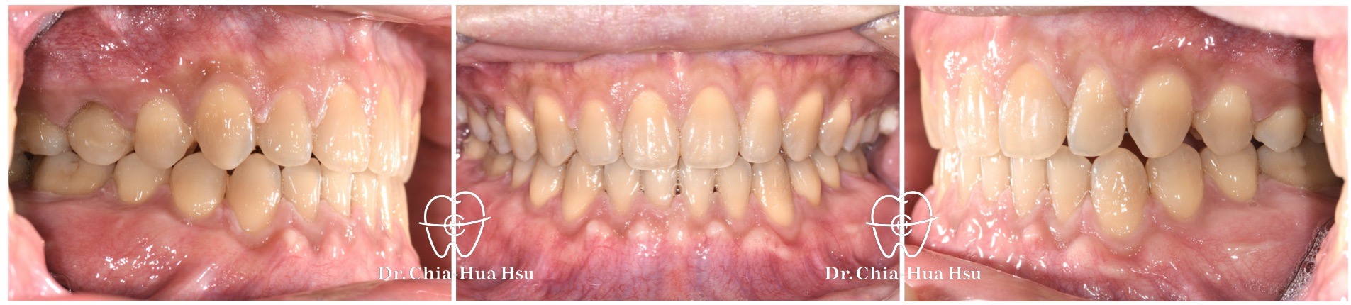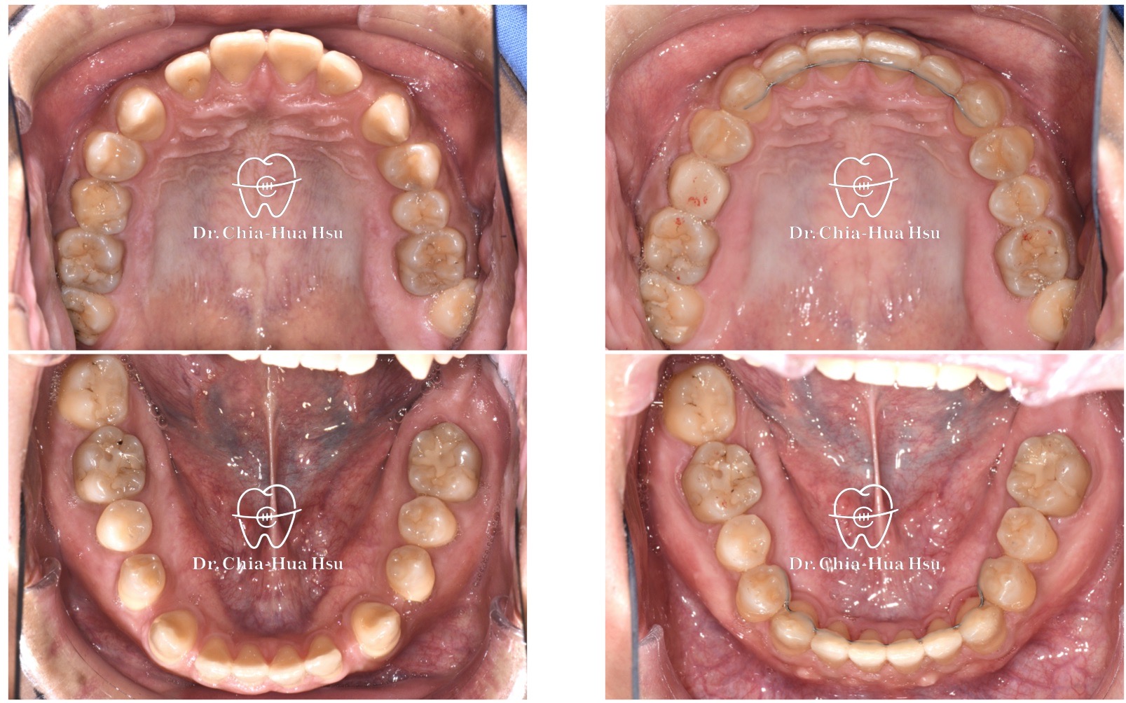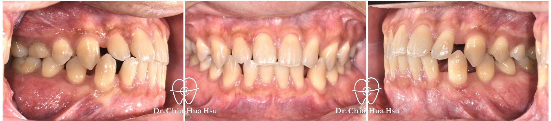 - 治療方式:使用傳統金屬矯正器,配合下顎頰側迷你骨釘拉動牙齒 ; 右上第二乳臼齒因為骨沾黏無法移動,故以樹脂修復、恢復咬合功能。
