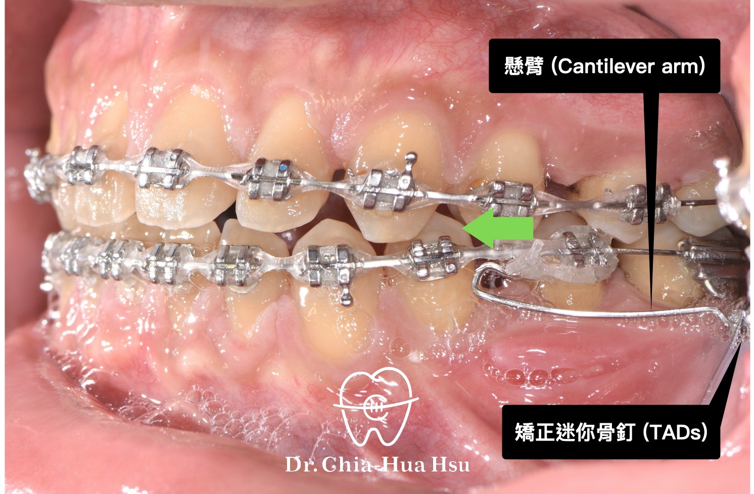 - 矯正小知識:懸臂 (Cantilever arm) 是一段由金屬絲 (多為不鏽鋼或鈦合金) 製作的細長結構,通常一端是固定在支點(Anchor tooth 或骨釘),另一端是自由懸空,藉由橡皮鏈、彈力線等方式,施力於目標牙齒。